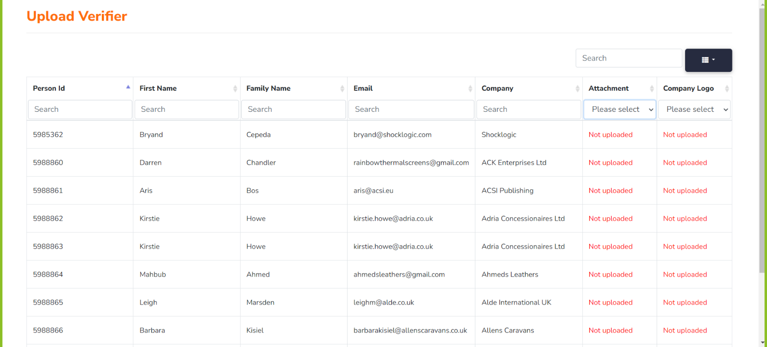 In this new screen displays you will see the Person ID, First Name, Last Name, Email and company information also you will have an additional column for each extrafields setup for attachment.