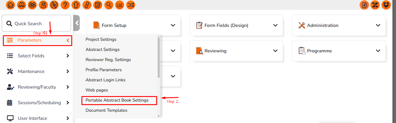 Within the Abstractlogic dashboard, navigate to 'Portable Abstract Book Settings' by selecting 'Parameters' from the left-side menu.