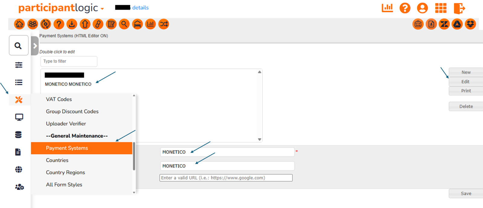 Go to “Maintenance”, then click on “Payment Systems”, and click on the “New” button. Write “MONETICO” as a “Payment System Type” and “MONETICO” as “description”.